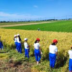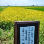 9/3 稲刈り体験をあずま北小学校5年生が行いました。授業の一環として近所の農家さんのご指導お手伝いをいただき行っているものです。田植え後農家さんに管理をしてもらい、立派な稲が育ち黄金色に実りました。