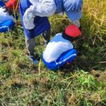10名の5年生が5月に植えた稲の刈り取りです。長靴に軍手、鎌を持って、黄金色実った稲穂を一列に並んで根元から刈っていきます。初めて手にした鎌、すこし怖さもありうまく使えず、見ているこちらも心配していましたが、徐々に上手くなり、10名で刈り取り完了。残りはコンバインお任せします。