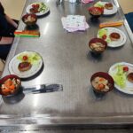 8時から12時まで、2クラスの授業の補助に入りました。内容は地域の食材を使った調理ということで「れんこんハンバーグ」「けんちん汁」を作りました。食材は予め用意し、野菜の下準備、調味料の計量、調理を生徒が全ておこないました。4〜5名の班で、分担し時間内に試食まで進められました。 大根にんじんのいちょう切りはスムーズ、ごぼうの皮をこそげとる、包丁の背でやること知っている生徒もいました👏里芋の皮むきはピーラーを使っていましたがすべってしまい難しそうでした。れんこんは刻むとすりおろしにするのですが、意外にすりおろしが大変そうでした。
