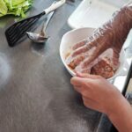 8時から12時まで、2クラスの授業の補助に入りました。内容は地域の食材を使った調理ということで「れんこんハンバーグ」「けんちん汁」を作りました。食材は予め用意し、野菜の下準備、調味料の計量、調理を生徒が全ておこないました。4〜5名の班で、分担し時間内に試食まで進められました。 大根にんじんのいちょう切りはスムーズ、ごぼうの皮をこそげとる、包丁の背でやること知っている生徒もいました👏里芋の皮むきはピーラーを使っていましたがすべってしまい難しそうでした。れんこんは刻むとすりおろしにするのですが、意外にすりおろしが大変そうでした。