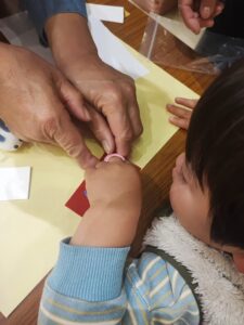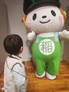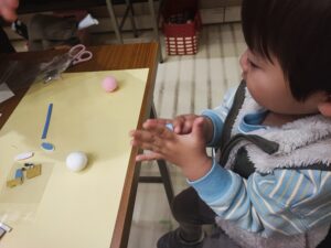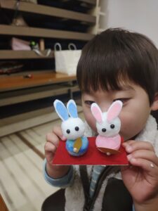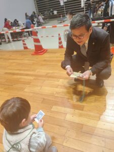 いなのすけと写真撮影、射的を楽しみ、2歳児ですが「ひな人形」を作りたいといことで教えてもらいました。みよう見真似でボンドをつけて、頭と体をつけ、耳をつけ完成‼️ 市長と会談もしましたよ笑笑😃
